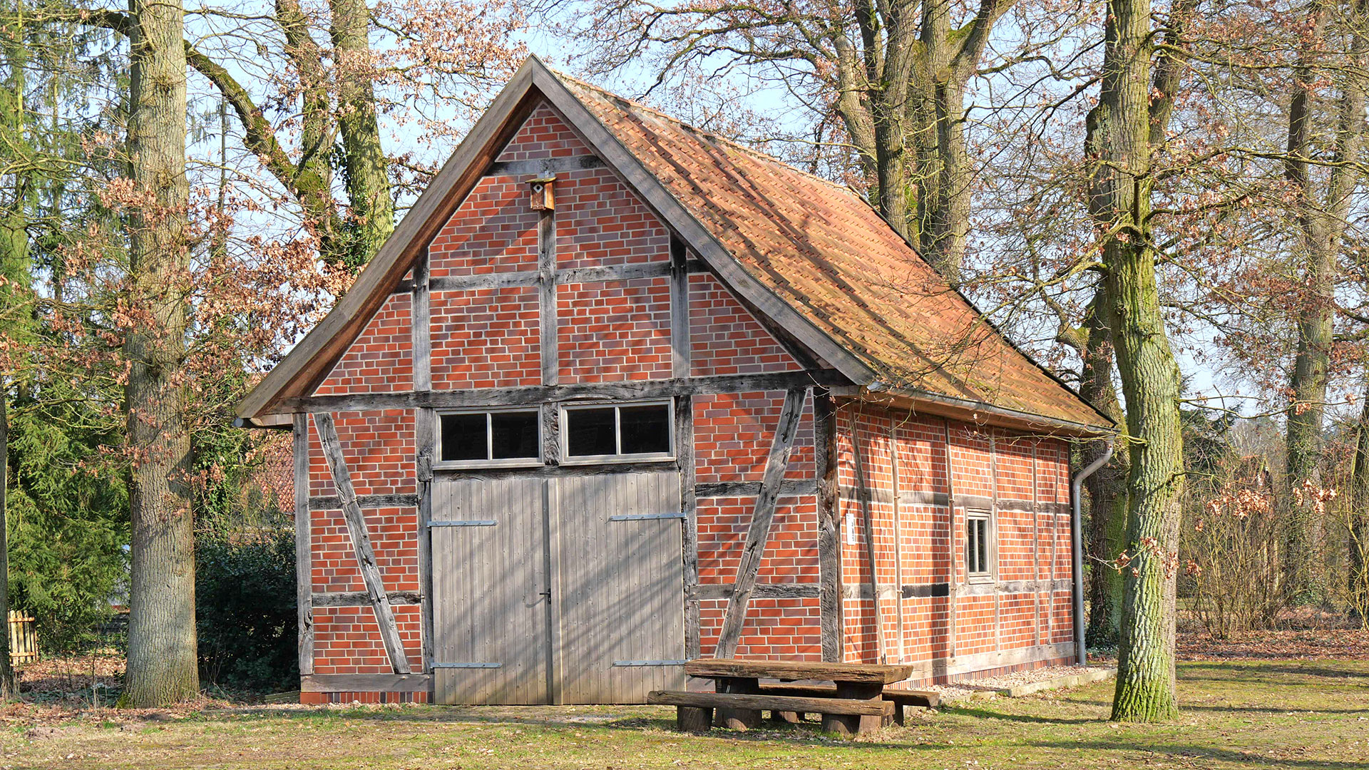 Einschiffige Halle mit giebelseitiger Erschließung in Fachwerkbauart, niedrige Torhöhe, Verblendmauerausfachung